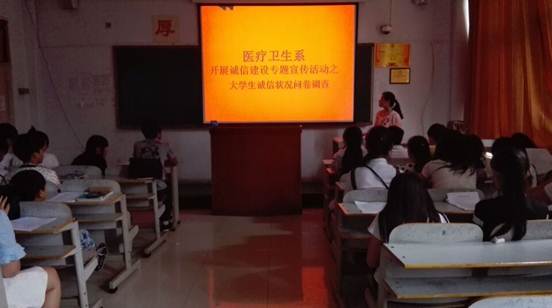 为进一步弘扬诚信精神,加强同学们的诚信意识,推进诚信教育在校园的传播,2015年6月2日,医疗卫生系举办诚信教育宣传活动并进行“老员工诚信状况问卷调查”。